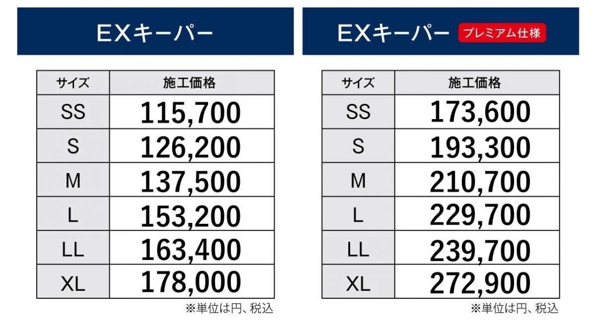 価格表をクリック(タップ)するとお車のサイズをお調べできます。