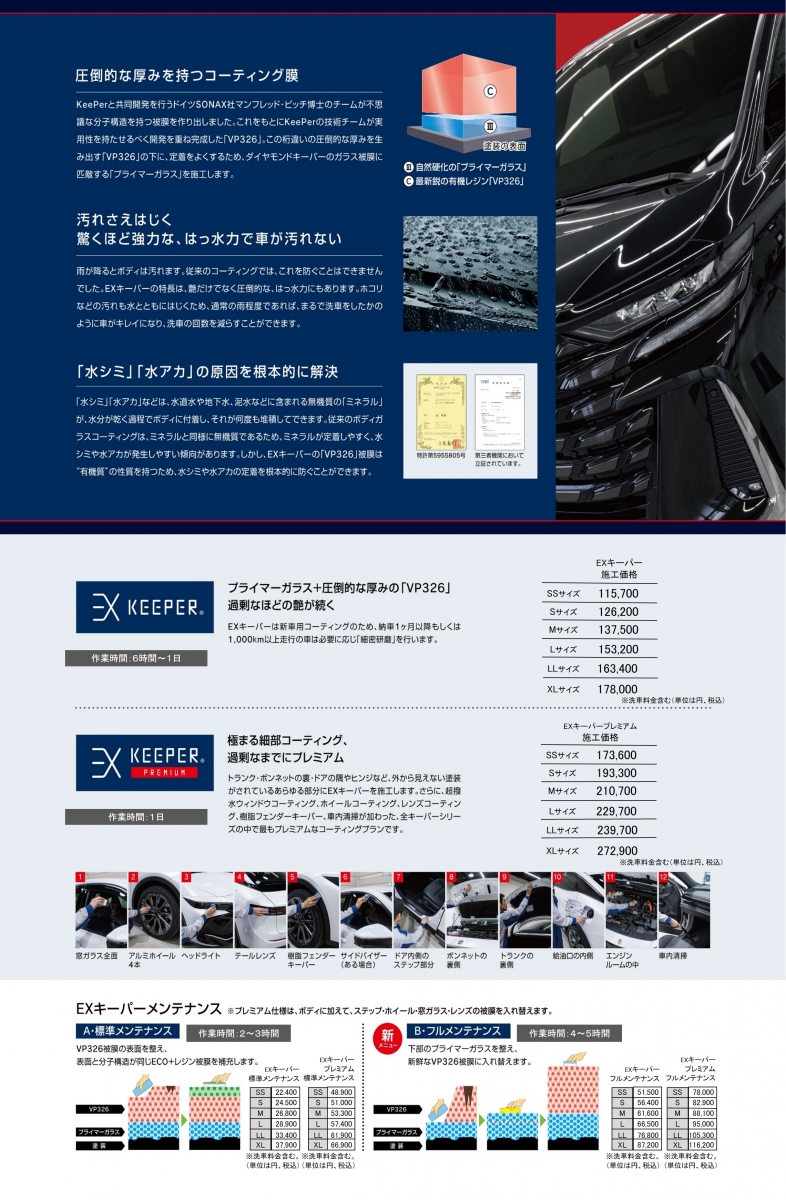 当店には2名の一級施工技術者が在籍しており、手洗い洗車から始まるすべてのキーパーメニューに対応できる体制を整えております。