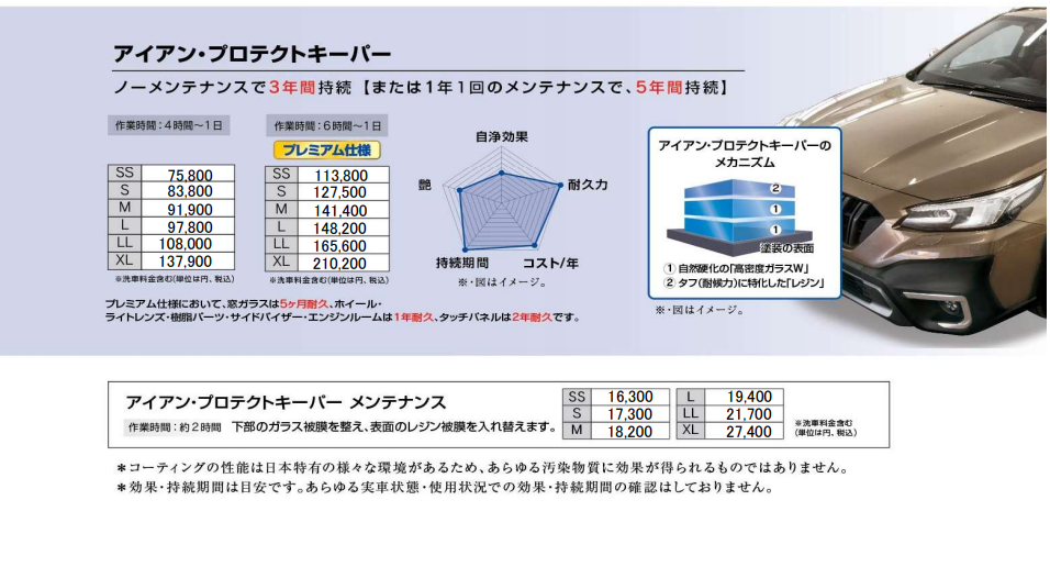 3年間ノーメンテナンス、洗車だけ。 (2年(又は1年)に1度のメンテナンスで、6年耐久)