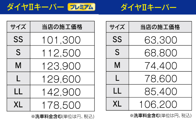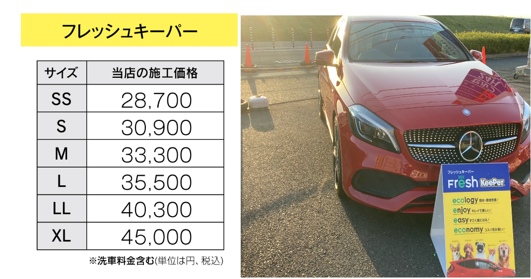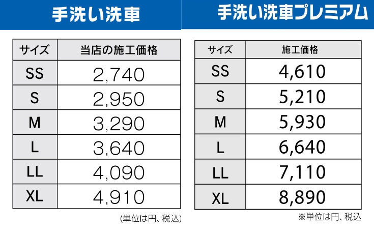 コーティングも手洗い洗車も、お車のサイズによって料金が異なります。