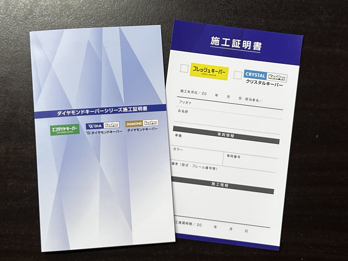 当店のクリスタルキーパー、ダイヤモンドキーパー、ECOプラス ダイヤモンドキーパー,EXキーパーには「施工証明書」を発行しております。