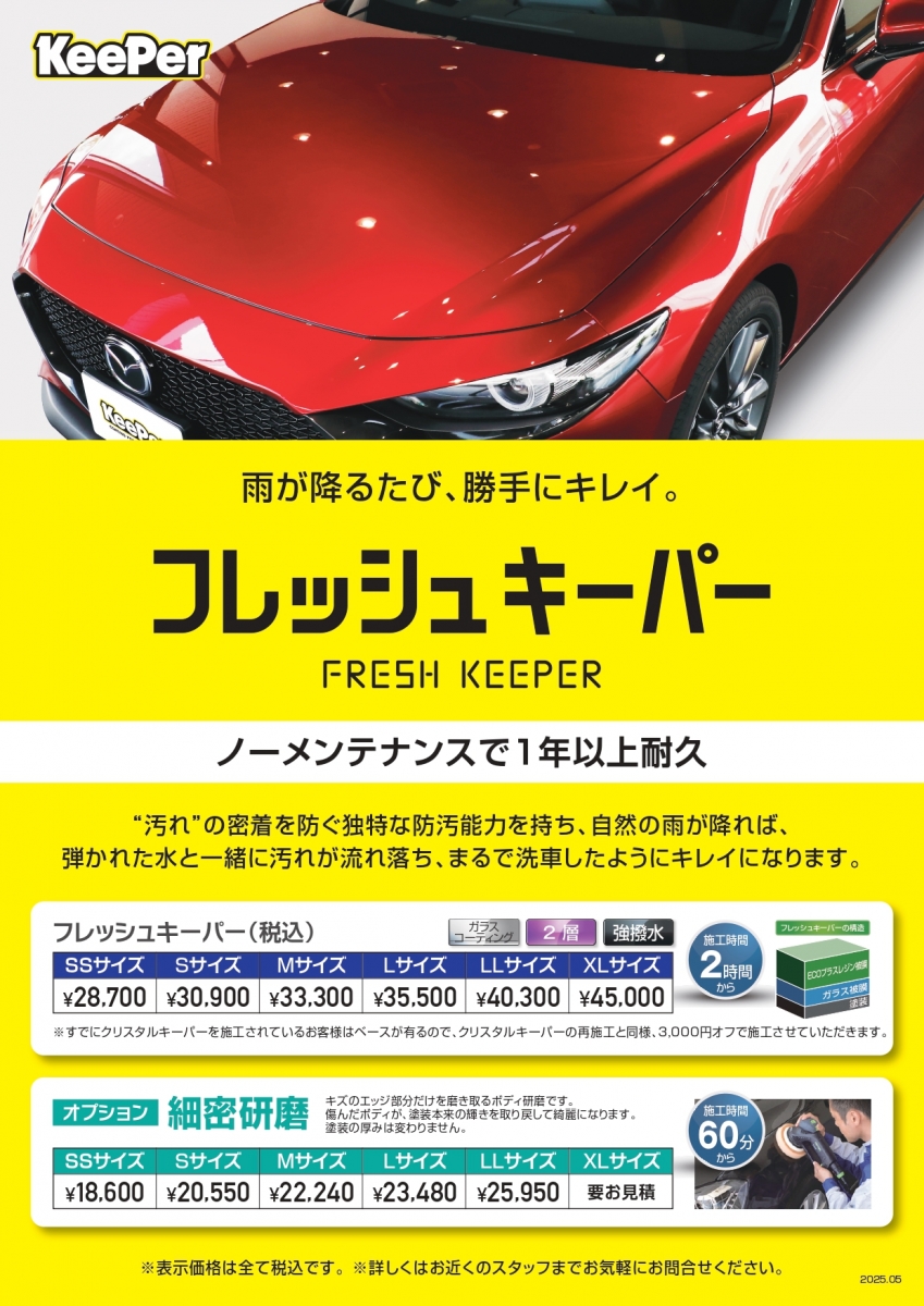フレッシュキーパーは、1年以上耐久の汚れ密着を防ぐ独特な防汚能力を持ち、ホコリが降り積もっても塗装面には密着せず、自然の雨が降れば元々持っている撥水力で、雨と一緒に汚れが落ち、まるで洗車をしたかのようにキレイになります。
