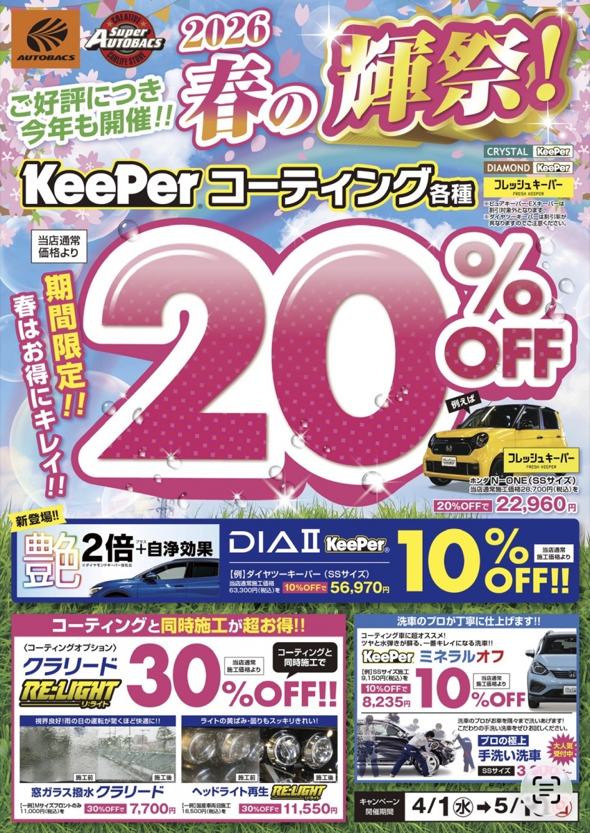 4月のキャンペーンです❗️コーティング20%キャンペーンになります🚗 ダイヤⅡキーパーも取り扱い可能、大変お得になっています‼️ 是非ご利用下さい❗️