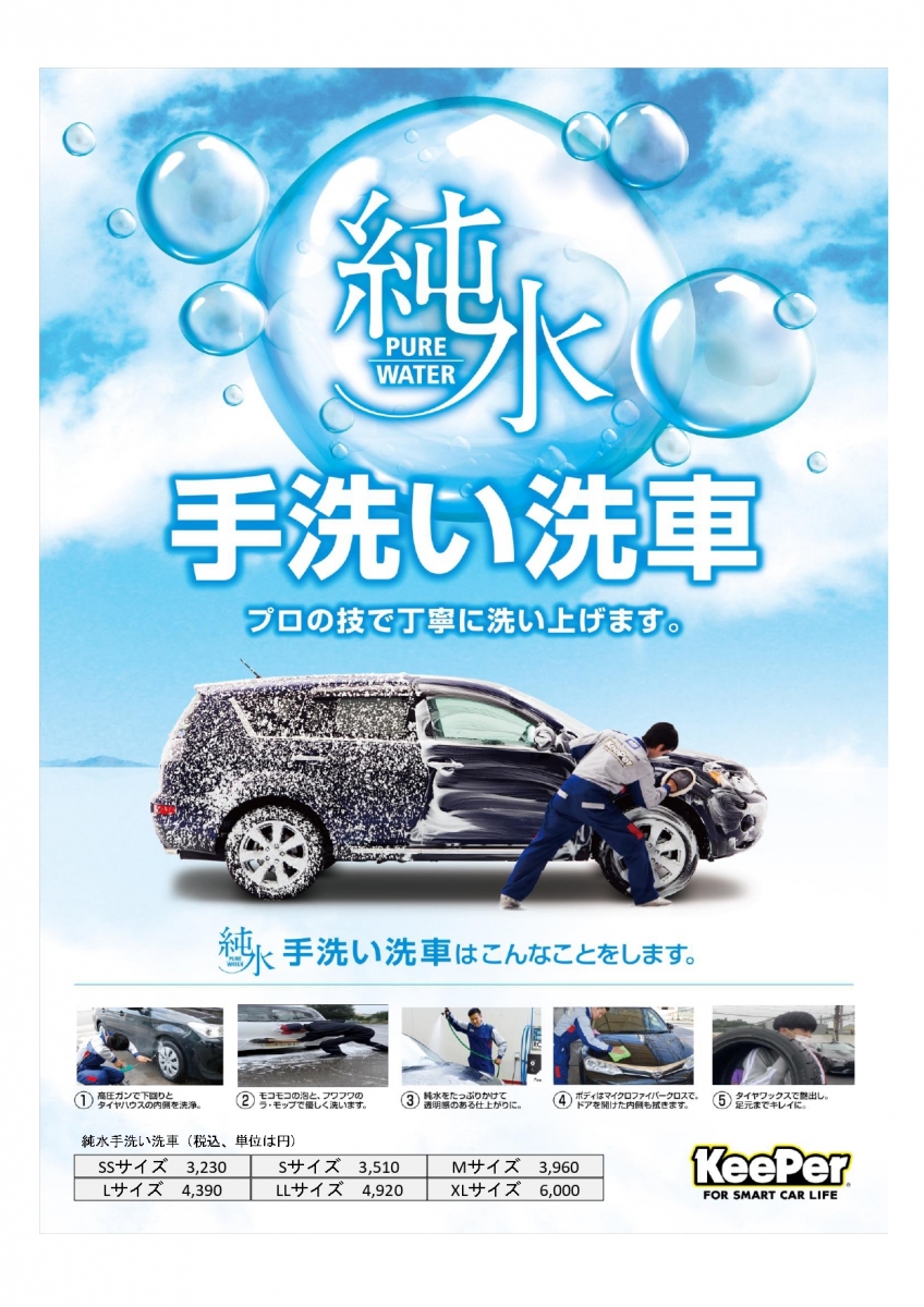 純水手洗い、キーパーコーティング、車検、各種作業を