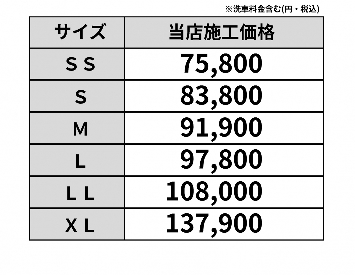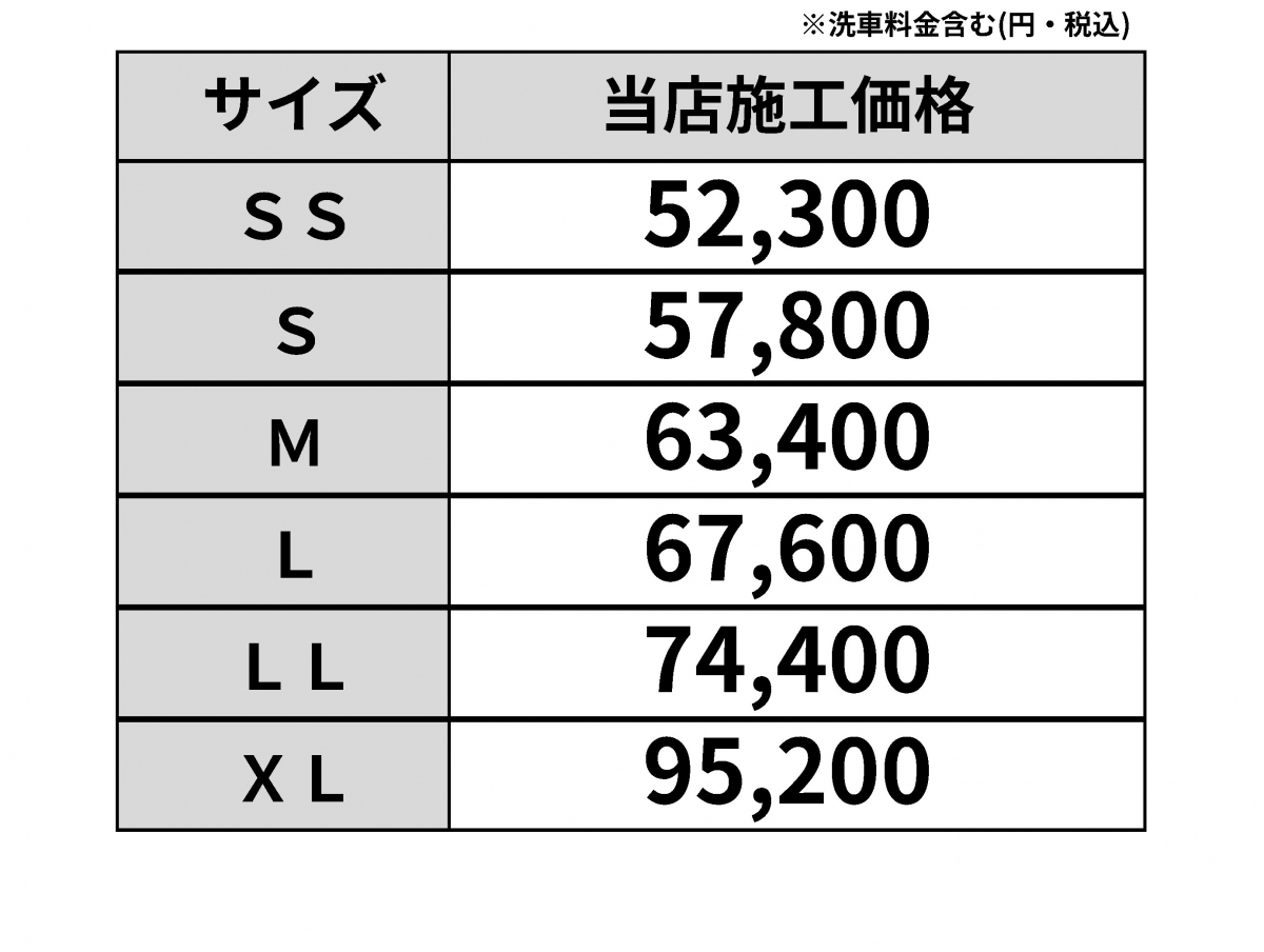フロント1面 (SSサイズ〜Mサイズ) 3720円 フロント1面 (Lサイズ〜XLサイズ) 3960円 全面 (SSサイズ〜Mサイズ) 8270円 全面 (Lサイズ〜LLサイズ) 9060円 全面(XLサイズ)9860円 時間20分~