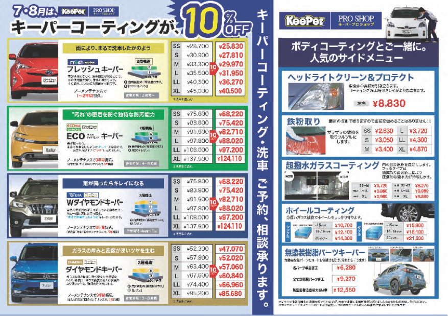 当店ではコーティングの施工証明書を発行しておりますので、万が一お車を板金修理などされる場合でも、再施工(部分施工)が自動車保険の適用になる場合がございますので大切に保管してください。