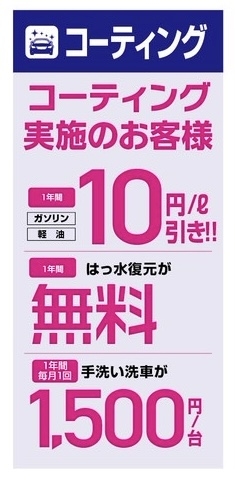 ☆当店でのコーティング施工で1年間何度でもガソリン・軽油が10円/L引き!