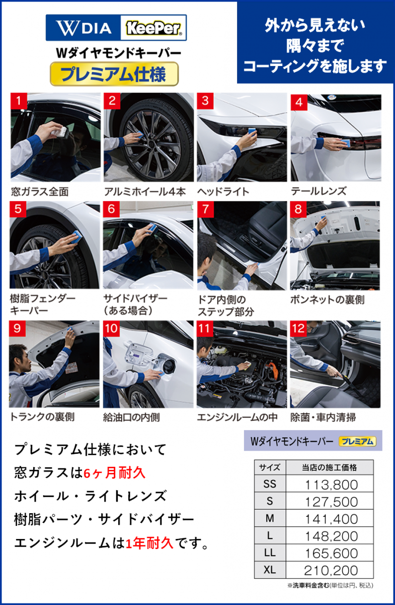 ボディコーティング(ガラス系コーティング・ポリマーコーティング)、窓ガラスコーティング(フッ素ガラスコーティング、シリコンコー ティング)ホイール コーティング、下回り防錆コーティング、エンジンルームコーティング等々コーティングに関することはコーティング技術認定店にお任せください ♪