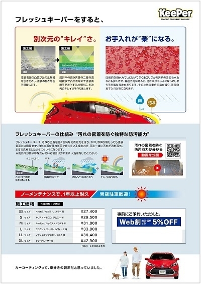話題沸騰中!当店取り扱いしております。 ECOプラスダイヤモンドキーパー 「自然の雨が洗車になる」 その独特な防汚能力は特殊なコーティング表面の分子構造の効果で ホコリが降り積もっても塗装表面には密着せず、自然の雨が降れば その撥水力で弾かれた水と一緒にホコリなどの汚れも流れ落ちて しまいます。 汚れを落とす能力が長けている新ボディガラスコーティングです。