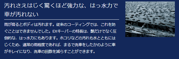 ・「ガラス被膜」がもつ、独特の「深いツヤ」と「発色」を「レジン被膜」がハイブリット効果で、より上質に強調します。ダイヤモンドキーパーの強い撥水角にレジンのすべりが加わり、真ん丸い水玉がコロコロとボディを滑り落ちます。