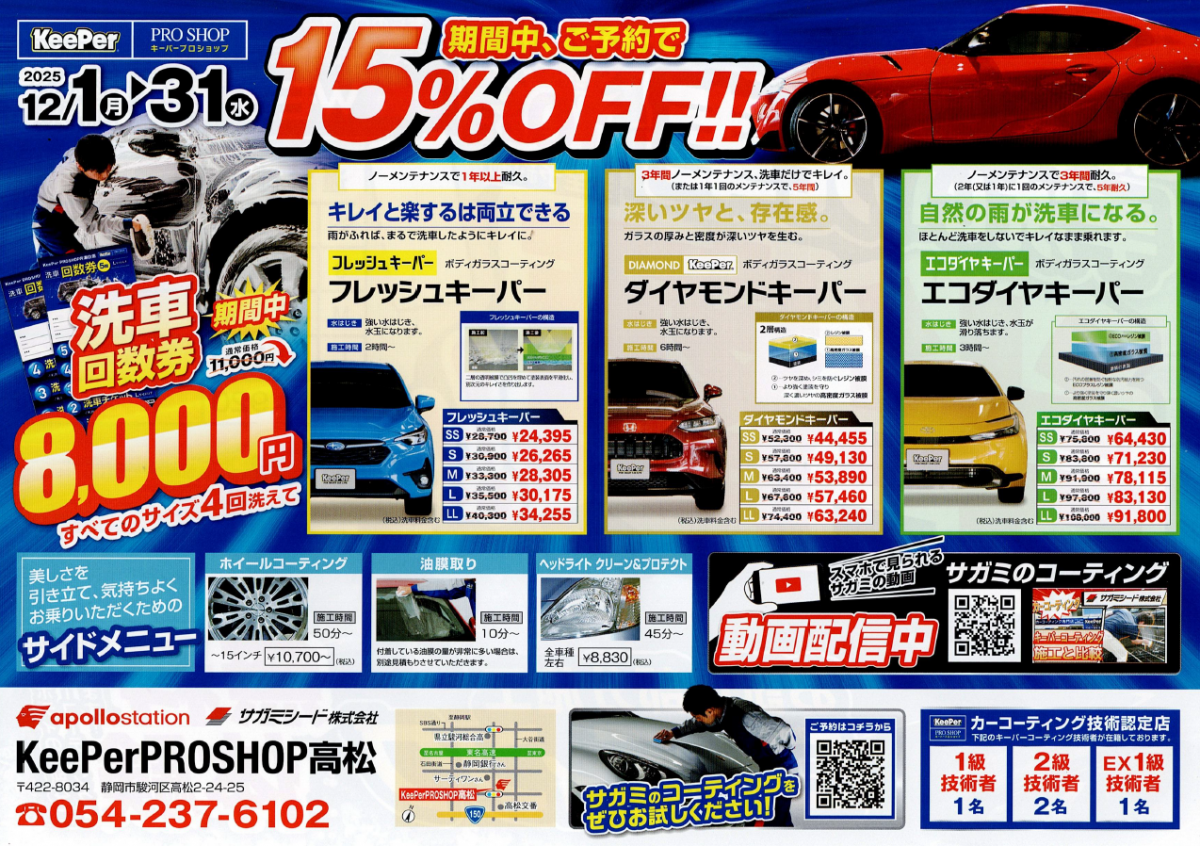 1年の締めくくりに、愛車をピカピカにしませんか?12月の1ヶ月間は、キーパーコーティング【フレッシュキーパー・ダイヤモンドキーパー・エコダイヤキーパー】を15%OFFでご提供いたします!