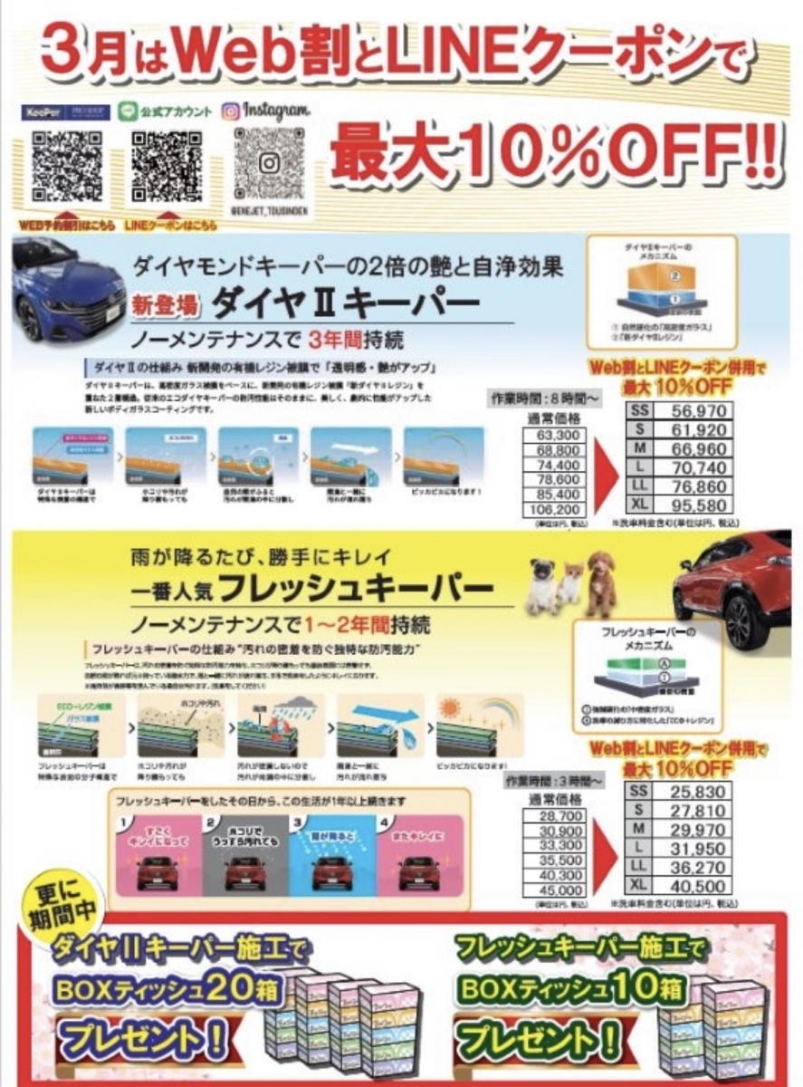 WEB新車10%OFF:新車登録から6ヶ月以内のお車は5%OFFとWEB割引両方適用で10%OFF(コーティングのみ)