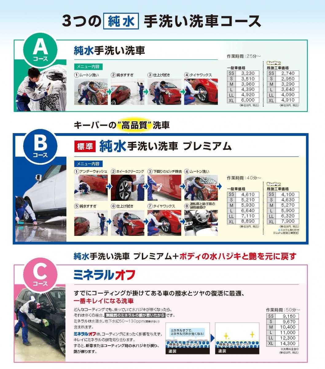 純水・手洗い洗車はこちらの3コースをご用意!