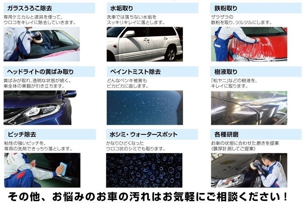 ホイール・窓ガラス・レンズ類・無塗装樹脂パーツ・下回り・ナビ・スマホまで、