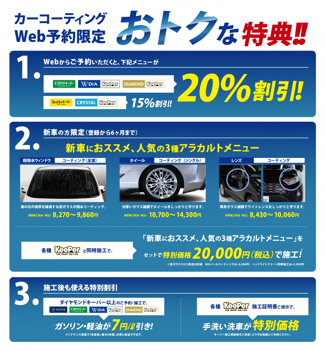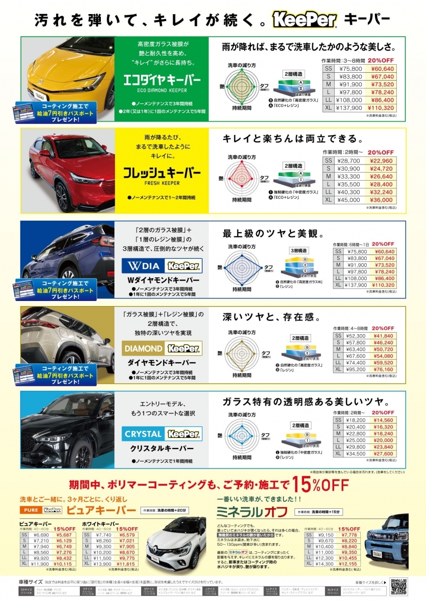 キーパーコーティングに新メニューが加わりました!その名も・・・DIAⅡKeeper(ダイヤ ツー キーパー)!新開発された有機レジン被膜で「透明感・艶がアップ」これによりエコダイヤキーパーの防汚性能は...