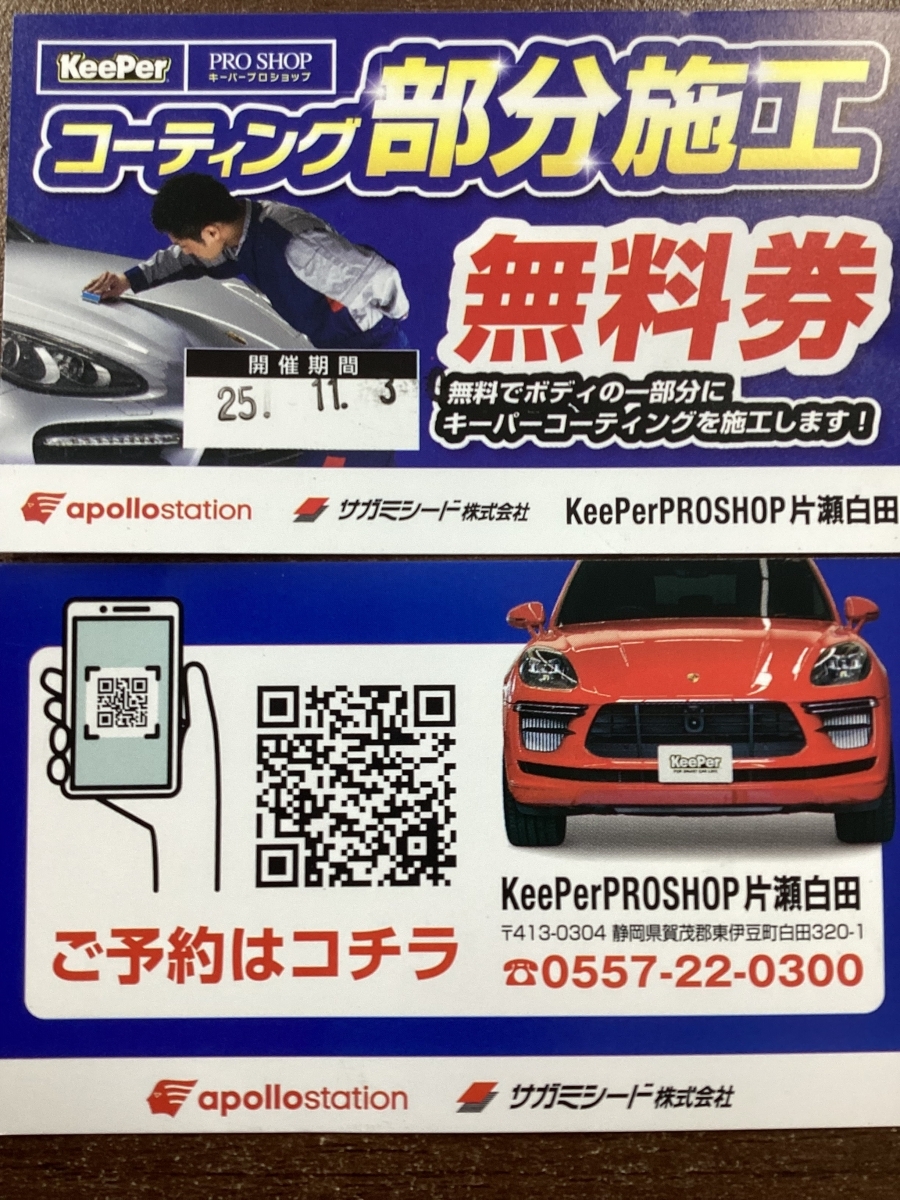 10月、11月は、気になるコーティングをお試しで部分施工実施中です♪ フレッシュキーパーやecoダイヤモンドキーパーも好評をえており体感できます!! 気になる方はお気軽にスタッフまでお声かけください♪
