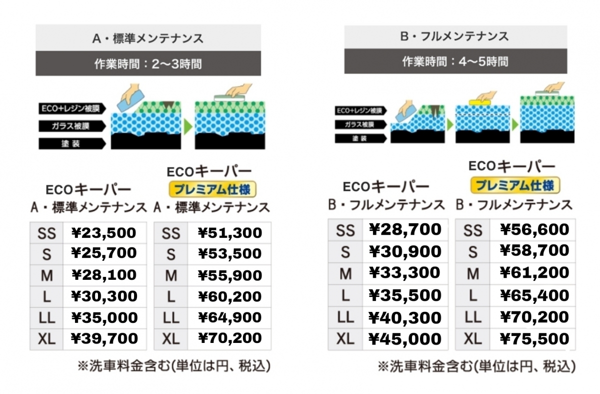 クリスタルキーパーのメンテナンス無しの1年間耐久の手軽さと艶感、そしてECOプラスダイヤモンドキーパーの雨が降れば洗車をしたように綺麗になる性能が加わった、キレイと楽を両立するコーティング。