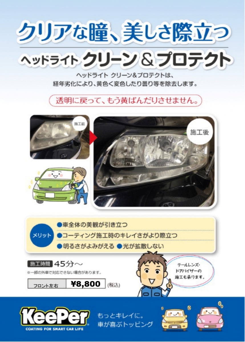 キーパーコーティングはたくさんのお客様からキレイになって良かった!との声を頂けるので、これからもお客様に喜んで頂けるコーティングを提供出来るよう日々精進して参ります。2級整備士の資格があり、オイルやタイヤなどのお困りの際は是非お待ちしております。