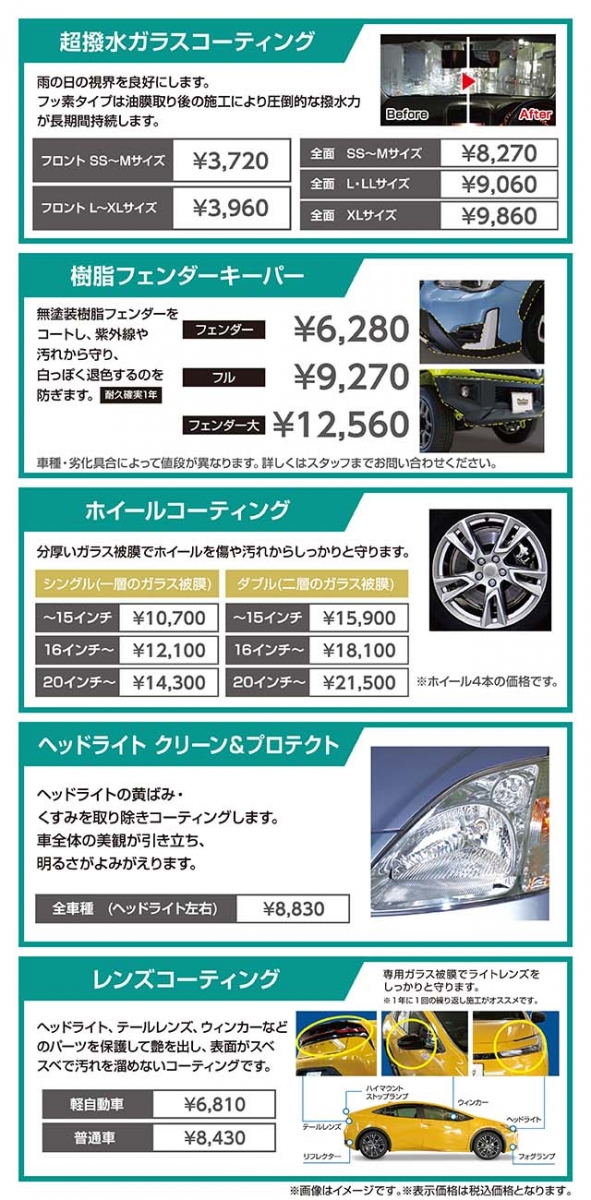 ※水ハジキがなく、表面が汚れたコーティングをケアします。 新車の時にやったコーティングの表面に、 洗車しても落ちない”うっすらとした膜のように“汚れが乗って、 水ハジキがなくなり、ツヤが鈍くなってきます。 洗車のついでに「ケア」をさせていただくと、 新車コーティングが本来の性能を発揮するようになって、 水ハジキもすっかり戻って、ツヤ感もアップします。