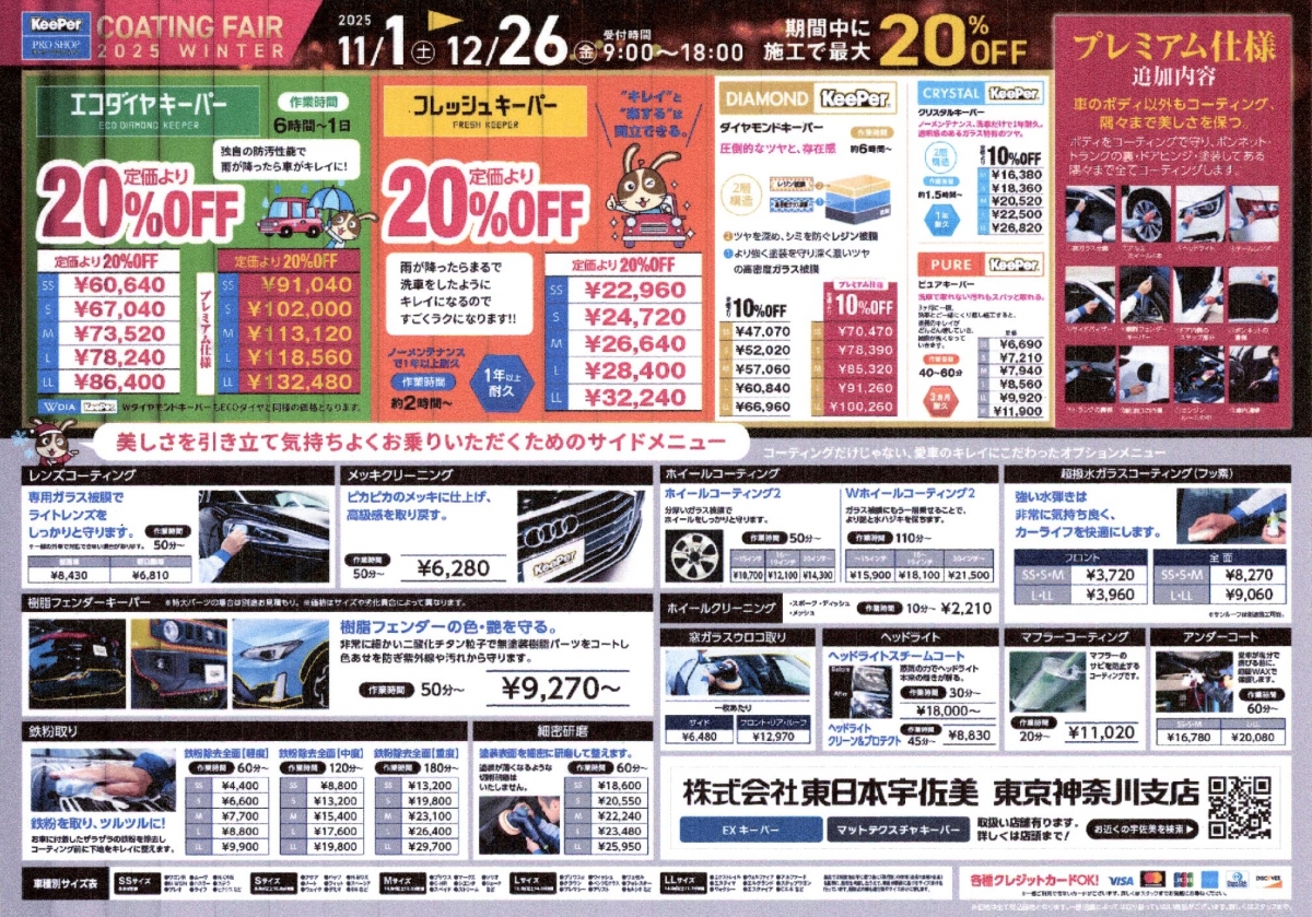 11/1~12/26までの期間、コーティングメニューを定価の10~20%OFFで施工できちゃいます!コーティングに興味のある方も再施工を検討中の方も今がチャンスです!豊富なオプションメニューも取り揃え、当店自慢のコーティングスタッフがお客様のお車をピカピカにしちゃいます👍