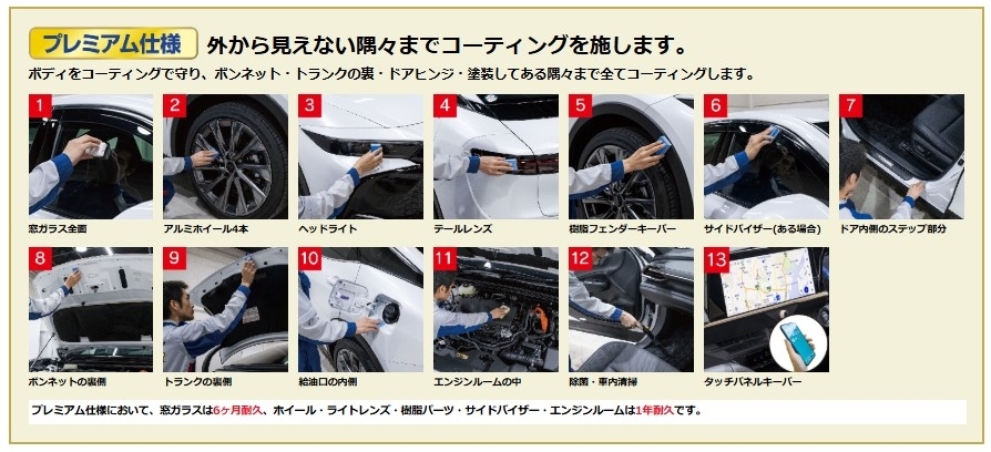また、当店ではコーティングの施工証明書を発行しております。万が一お車を板金修理などされる場合の再施工(部分施工)が各種自動車保険の適用になる場合がございます。大切に保管してください。