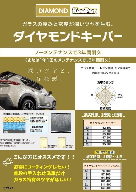ボディを3層構造のダブルダイヤキーパーで守り、ボンネット、トランクの裏、ドアヒンジ、塗装してある部分を全てコーティングします。