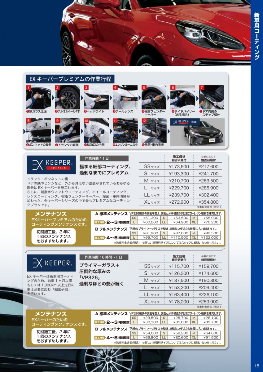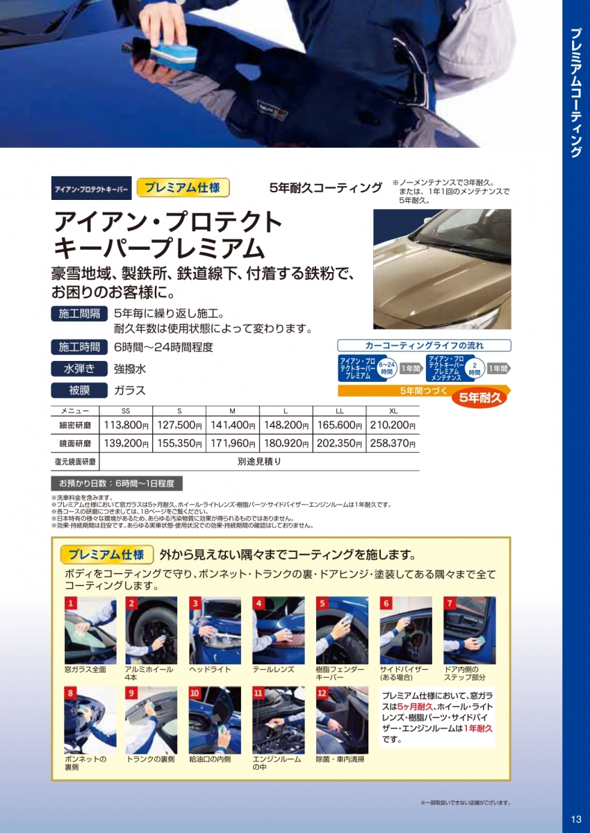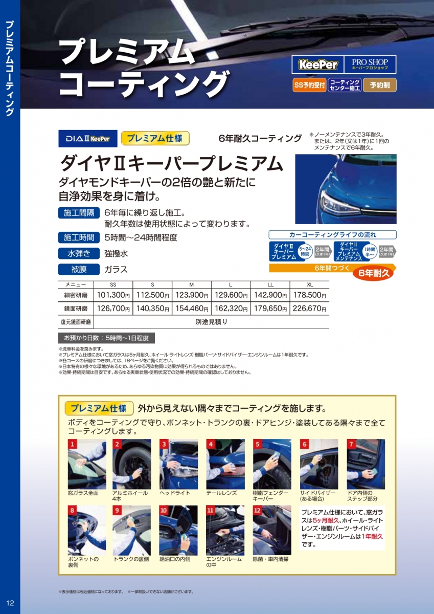 カーコーティング技術認定店で、多くのオプションメニューもあり、施工後のアフターフォローまで徹底的にさせて頂いております。