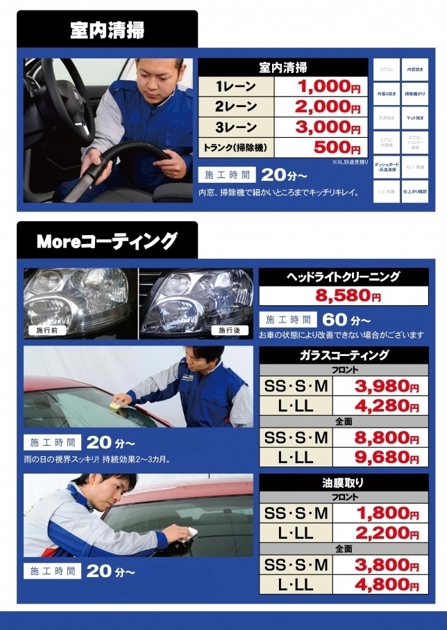 室内清掃の値段がサイズ関係なく一律になり、列ごとのお値段設定になりました。