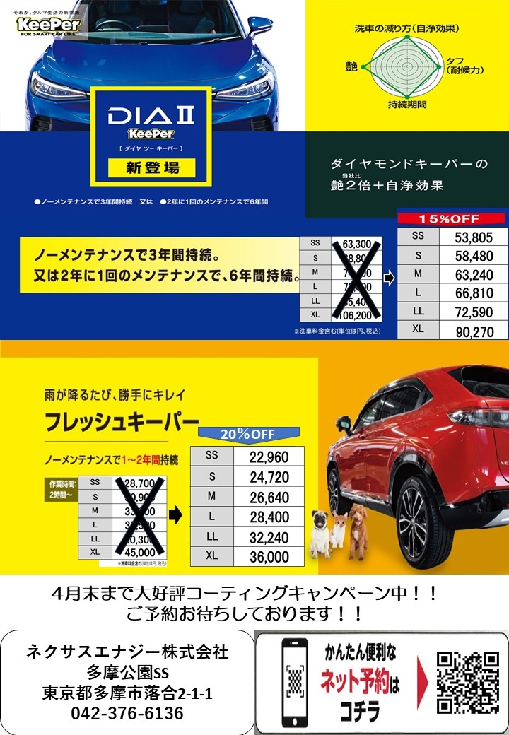 それに伴いまして、コーティングもフレッシュキーパー20%OFF、新商品DIAⅡキーパー15%OFFキャンペーンを実施致します!!