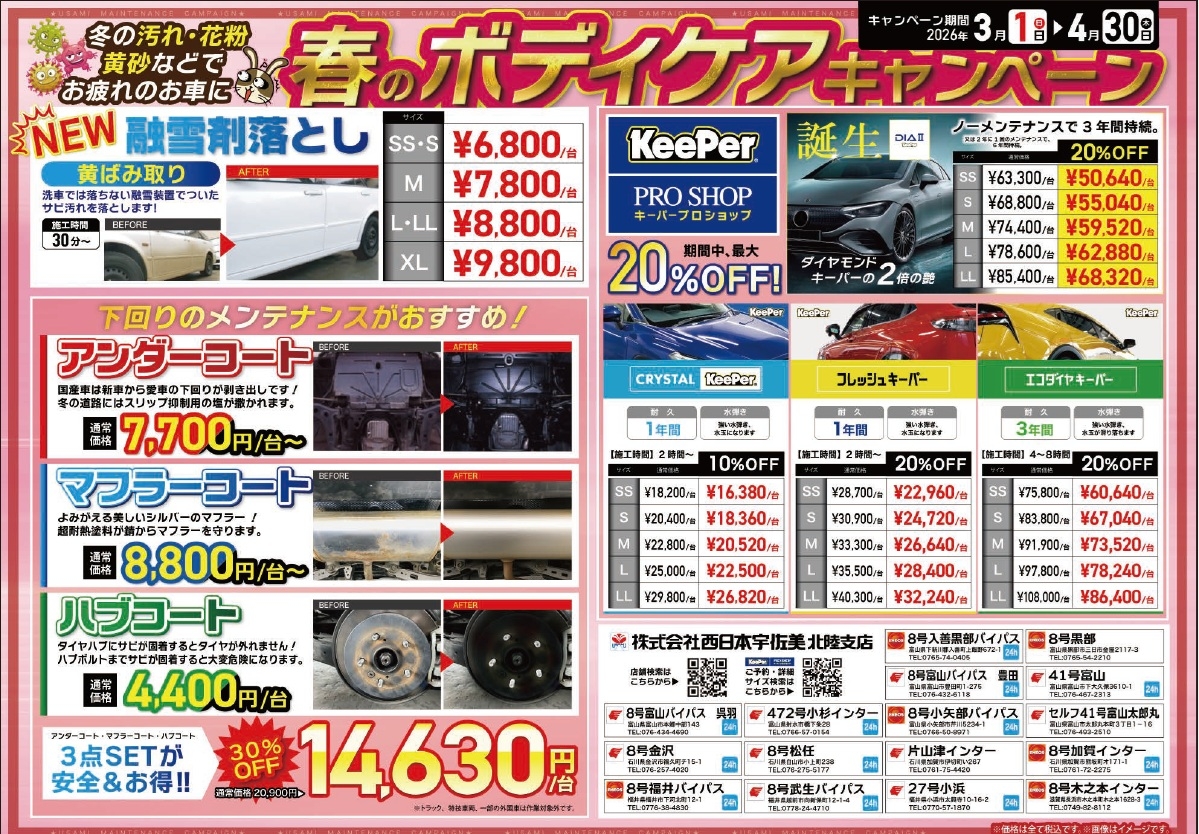 しつこい水垢には・・・ホワイトキーパーがおすすめ!KeePer独自のプロ専用クリーナーで水垢を除去した上でコーティングをします。 施工時間は40分~1.5時間。お待ちの間に完成します!(^^)! 価格は、SSサイズ7,740円・Sサイズ8,260円・Mサイズ9,300円・Lサイズ10,200円・LLサイズ11,500円・XLサイズ13,900円です。 ※表記の価格は、手洗い洗車・水垢除去・ピュアキーパーがセットになった税込価格です。ご予約優先しておりますが、当日の施工も大歓迎です!まずはお気軽にご来店・ご相談下さい!