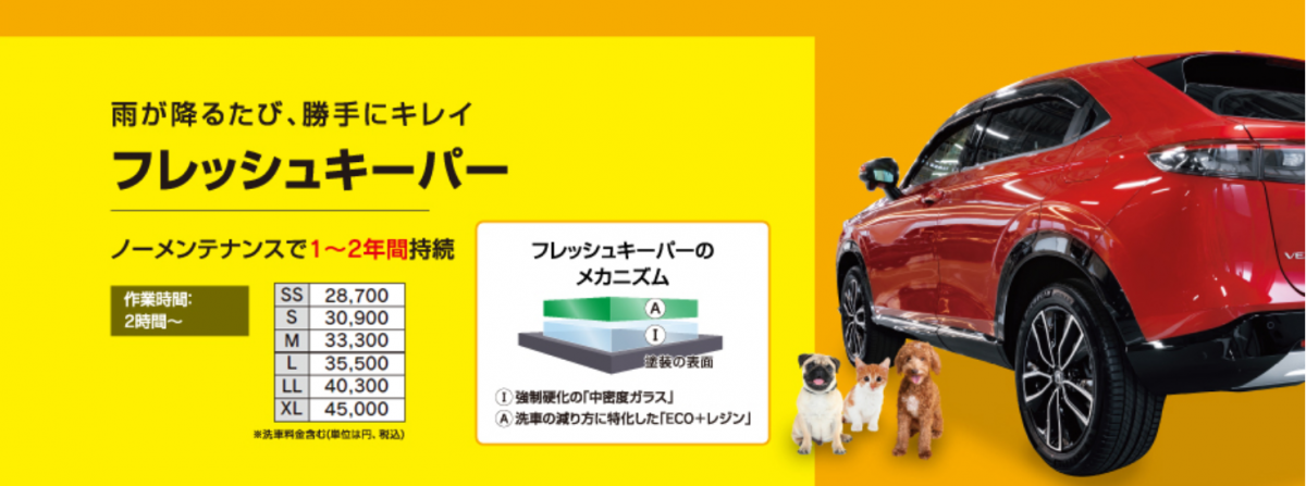 フレッシュキーパーは、汚れの密着を防ぐ独特な防汚能力を持ち、ホコリが降り積もっても塗装表面には密着せず、自然の雨が降れば元々持っている撥水力で、雨と一緒に汚れが流れ落ち、まるで洗車をしたようにキレイになります。