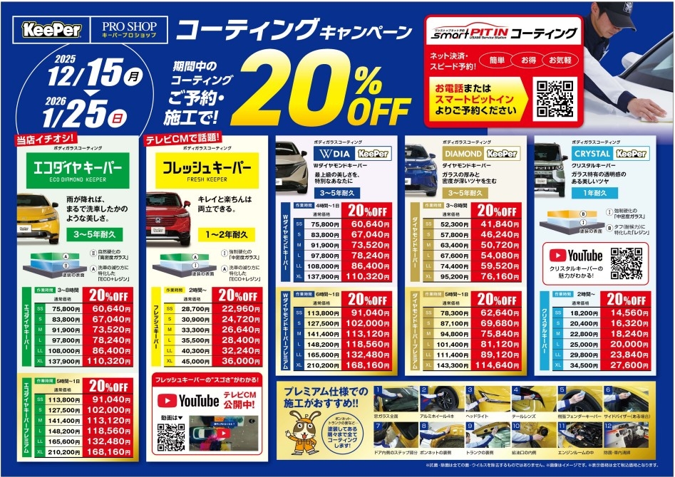 ・コーティング施工中の代車をご希望のお客様は事前にお申し出ください。