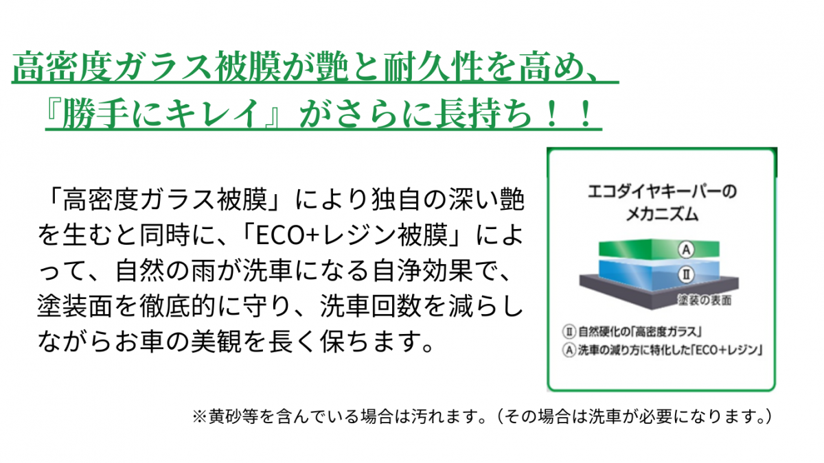フレッシュキーパーは、汚れの密着を防ぐ特殊な防汚能力を持ち、ホコリが降り積もっても塗装表面には密着せず、自然の雨が降れば元々持っている撥水力で、雨と一緒に汚れが流れ落ち、まるで洗車をしたようにキレイになります。