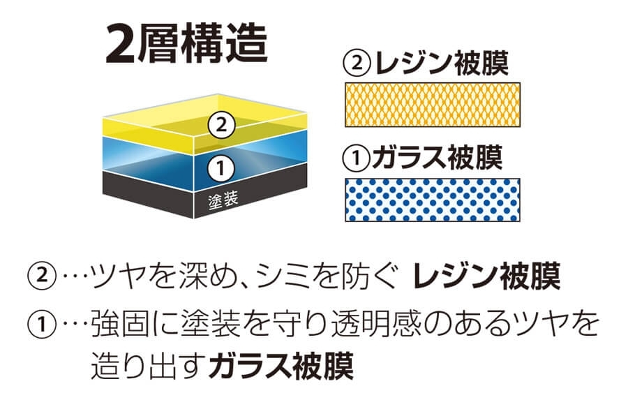 「2層のガラス被膜」+「1層のレジン被膜」の3層構造で、圧倒的な艶が続く!!