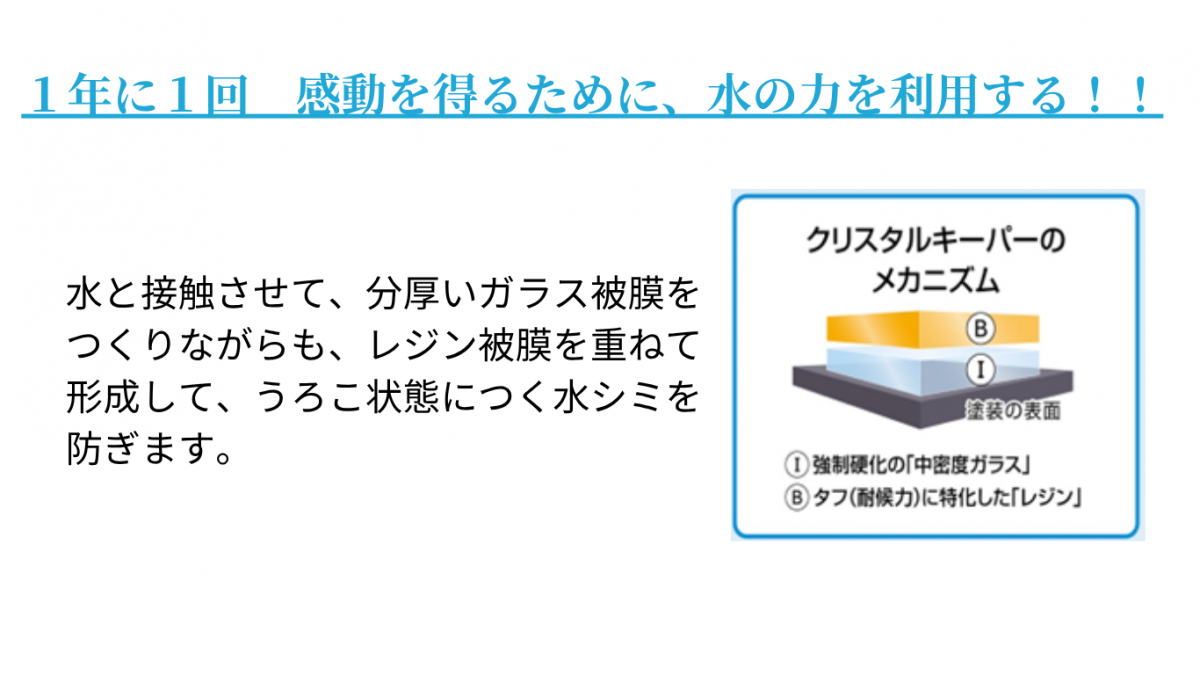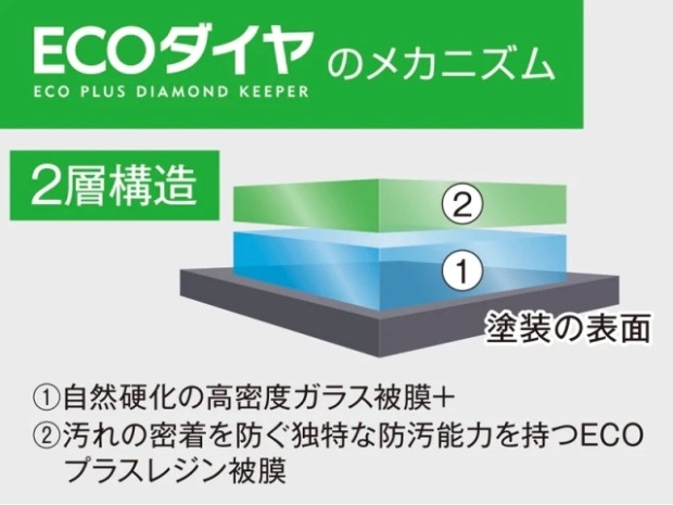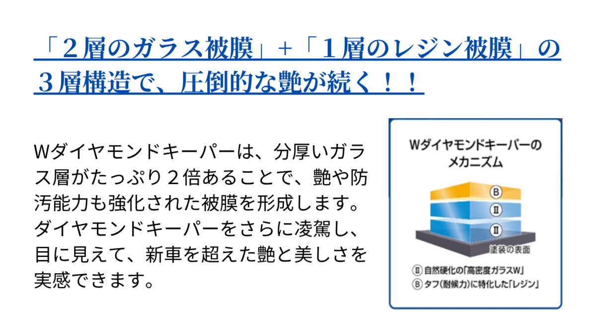 ツヤを深め、シミを防ぐレジン被膜と、強固に塗装を守り、透明感のツヤの高密度ガラス被膜の2層の被膜で外部からの攻撃を受け止め、塗装を守ります。