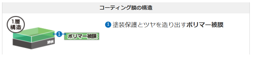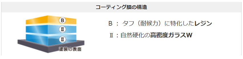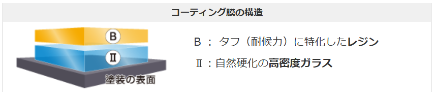 二層の被膜は屈折率が異なっていて塗装表面の微妙な凹凸を埋める働きがあり、塗装表面を平滑化させて別次元のキレイさを作り出します。