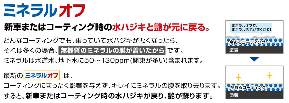 コーティングには影響を与えずにミネラル膜を除去して、施工直後のように水弾きとツヤを復活させます。