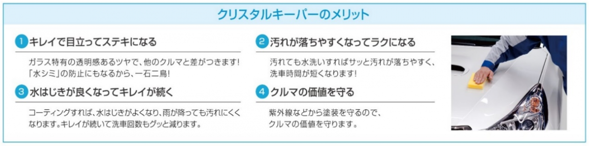クリスタルキーパーは、塗装を守り透明感あるツヤを作り出すガラス被膜と、ツヤを深め水シミを防ぐレジン被膜の2層構造のガラスコーティングです。