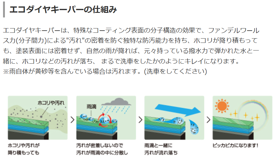 汚れが固着しにくいので、雨が降ると水と一緒に汚れも流れ落ちてキレイになるんです。