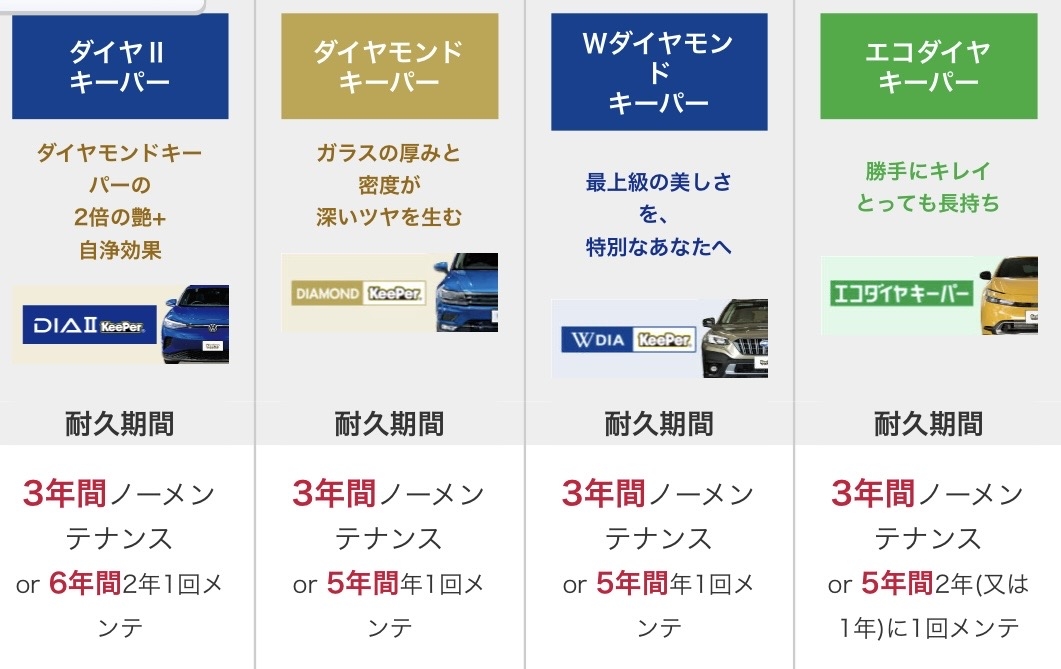 ダイヤ、Wダイヤ、エコダイヤ、ダイヤ2キーパーが20%OFFでご利用頂けます!新車施工時に大人気のコーティングです。