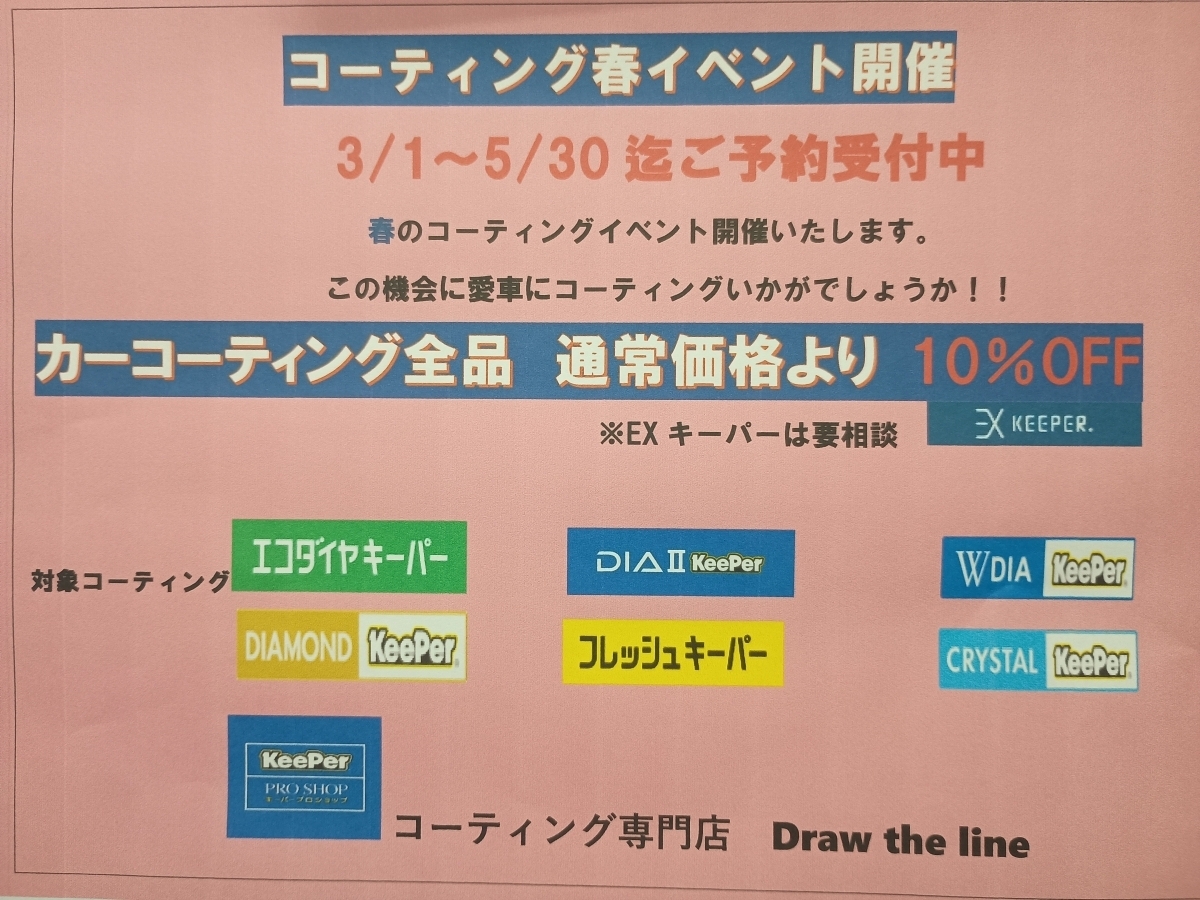 期間中ボディコーティング10%OFF致します。3・4・5月は予約が埋まる可能性もありますので、希望日ございましたら早めの予約をお勧めいたします