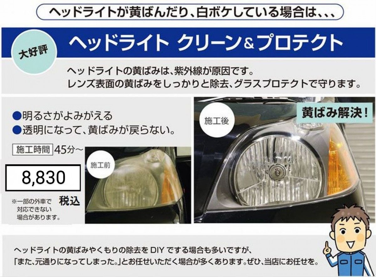 もしくわ、ヘッドライトクリーン&プロテクト(8,830円ヘッドライトのみコーティング)をおすすめします。磨いてキレイな状態にし、コーティングを施工します。