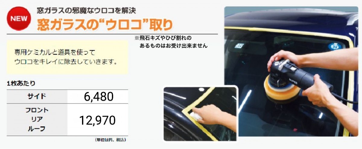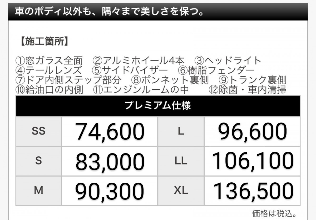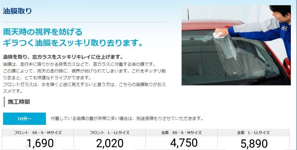 ・フッ素ガラスコーティングの耐久性は3ヶ月から6ヶ月。施工時間は15分からですが、油膜取りの作業から、フッ素コーティング、乾燥、拭き取りという工程をキッチリ行うと30分程いただきます。