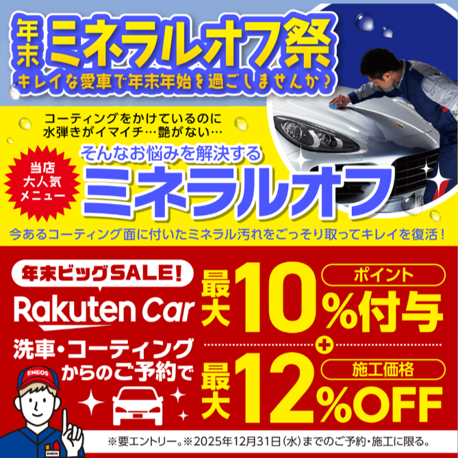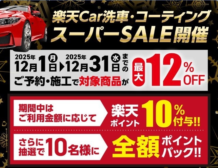 楽天Car洗車・コーティングスーパーSALE開催ご予約・施工で対象のコーティングが最大12%OFF期間中はご利用金額に応じて楽天ポイント10%付与さらに抽選で10名様に全額ポイントバック!!...