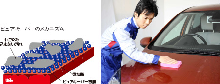 ピュアキーパーとは、「塗装のためになるコーティング」をコンセプトに、ワックスの時代の発想を180゜転換した新しい考え方【分子量200,000以上の高分子共重合体(コ・ポリマー)】から出来ています。コ・ポリマーは分子同士が、油性汚染物質をコーティング膜内に浸透させにくい立体的な網目状の被膜を形成します。