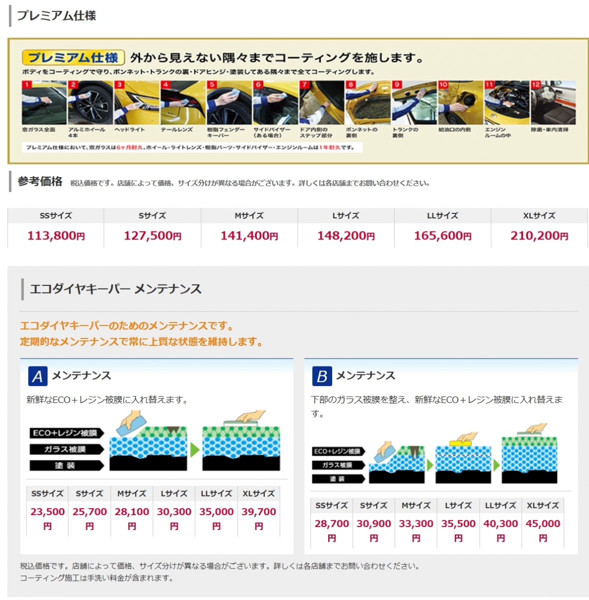 プレミアム仕様において、窓ガラスは6ヶ月耐久、ホイール・ライトレンズ・樹脂パーツ・サイドバイザー・エンジンルームは1年耐久です。