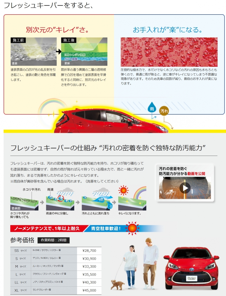 フレッシュキーパーは、汚れの密着を防ぐ独特な防汚能力を持ち、ホコリが降り積もっても塗装表面には密着せず、自然の雨が降れば元々持っている撥水力で、雨と一緒に汚れが流れ落ち、まるで洗車をしたようにキレイになります。 ※雨自体が黄砂等を含んでいる場合は汚れます。(洗車をしてください)
