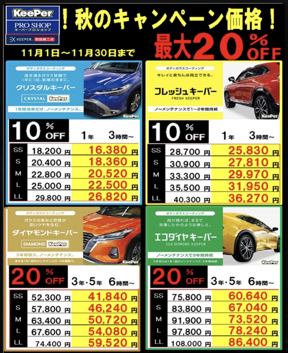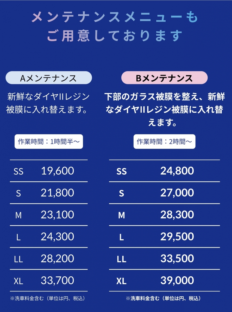 ●超撥水ガラスコーティング(フッ素) フロント SS〜M ¥3,720- L~LL ¥3,960- 全面 SS〜M ¥8,270- L~LL ¥9,060- ●ヘッドライトクリーン&プロテクト 全車種 ¥8,800- ●ヘッドライトスチーマー 全車種 ¥16,500- ●ホイールコーティング 15インチ まで¥10,700- 16〜19インチ ¥12,100- 20インチ~ ¥14,300- ●ホイールコーティングダブル 15インチ まで¥15,900- 16〜19インチ ¥18,100- 20インチ~ ¥21,500- ●室内清掃 SS ¥2,200- S ¥2,530- M ¥2,750- L ¥2,970- LL ¥3,300-