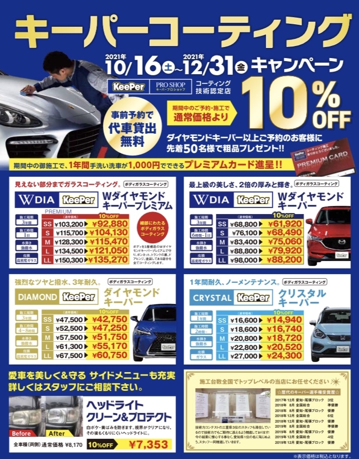 万が一、キーパーコーティングを施工して、車を鈑金塗装することになってしまったら塗装し直した部分は、コーティングがなくなってしまいます。修理した箇所の部分コーティングさせていただきます。1パネルにつき、コーティング価格の15%です!!!