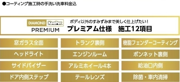 ダイヤモンドキーパープレミアム仕様はボディー以外にも上記12項目の部分も合わせてコーティングします。細かな部分も美しくしく仕上げたいお客様におススメになります。